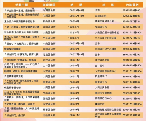臺北市政府為使社區大眾重視少子女化、高齡化、新移民、家庭價值及性別平等人口議題,由臺北市各區公所依據各地方特色、產業人口結構及文化特色等,舉辦各種人口政策宣導活動,詳細活動內容、日期、地點請洽各區公所人文課,歡迎大家踴躍參加喲!