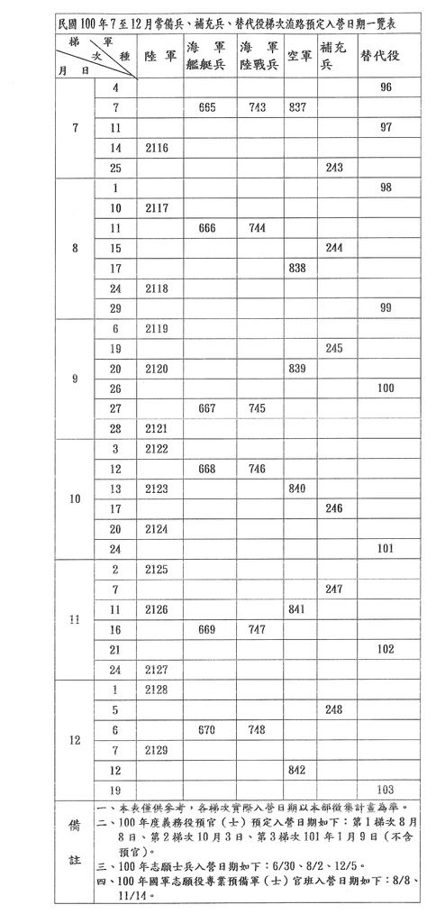 100年7至12月常備兵、補充兵、替代役梯次流路預定入營日期一覽表